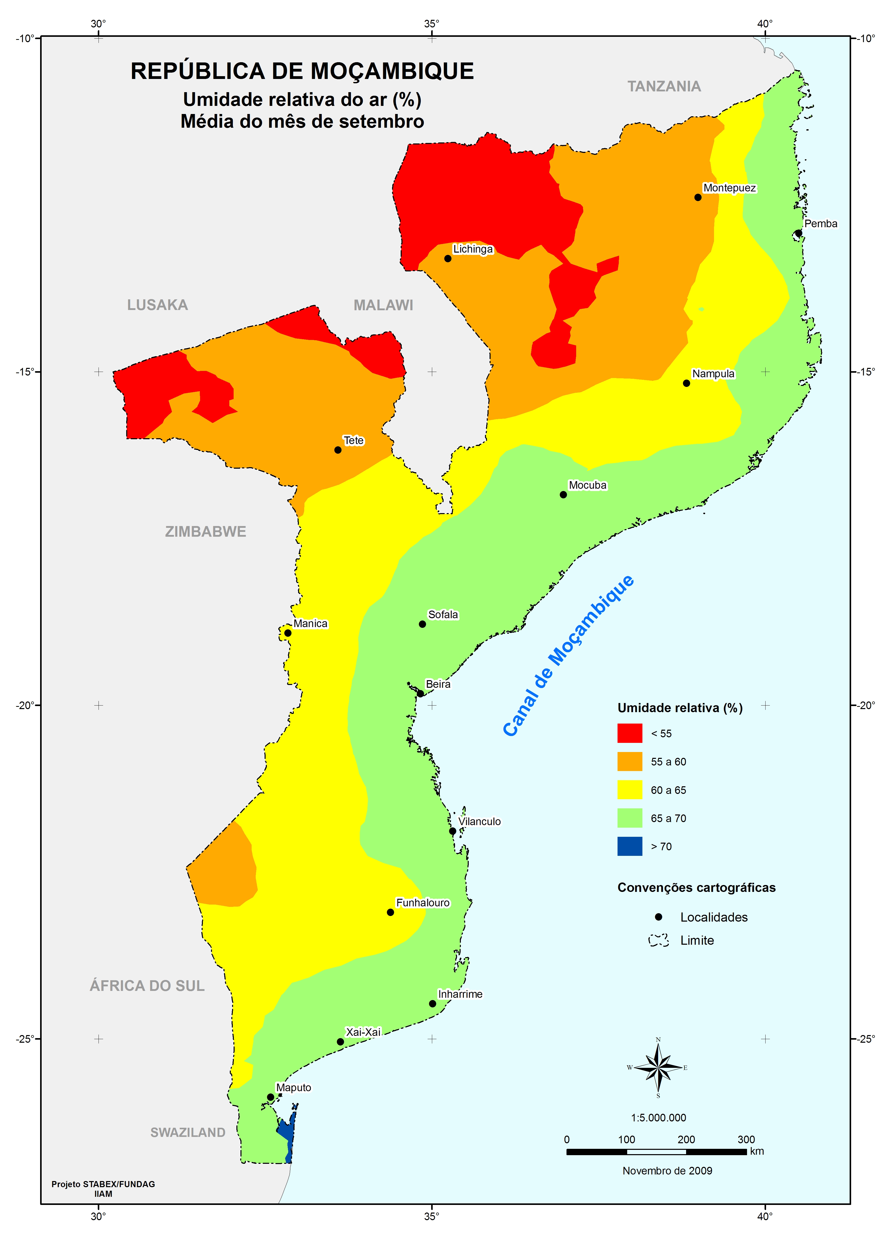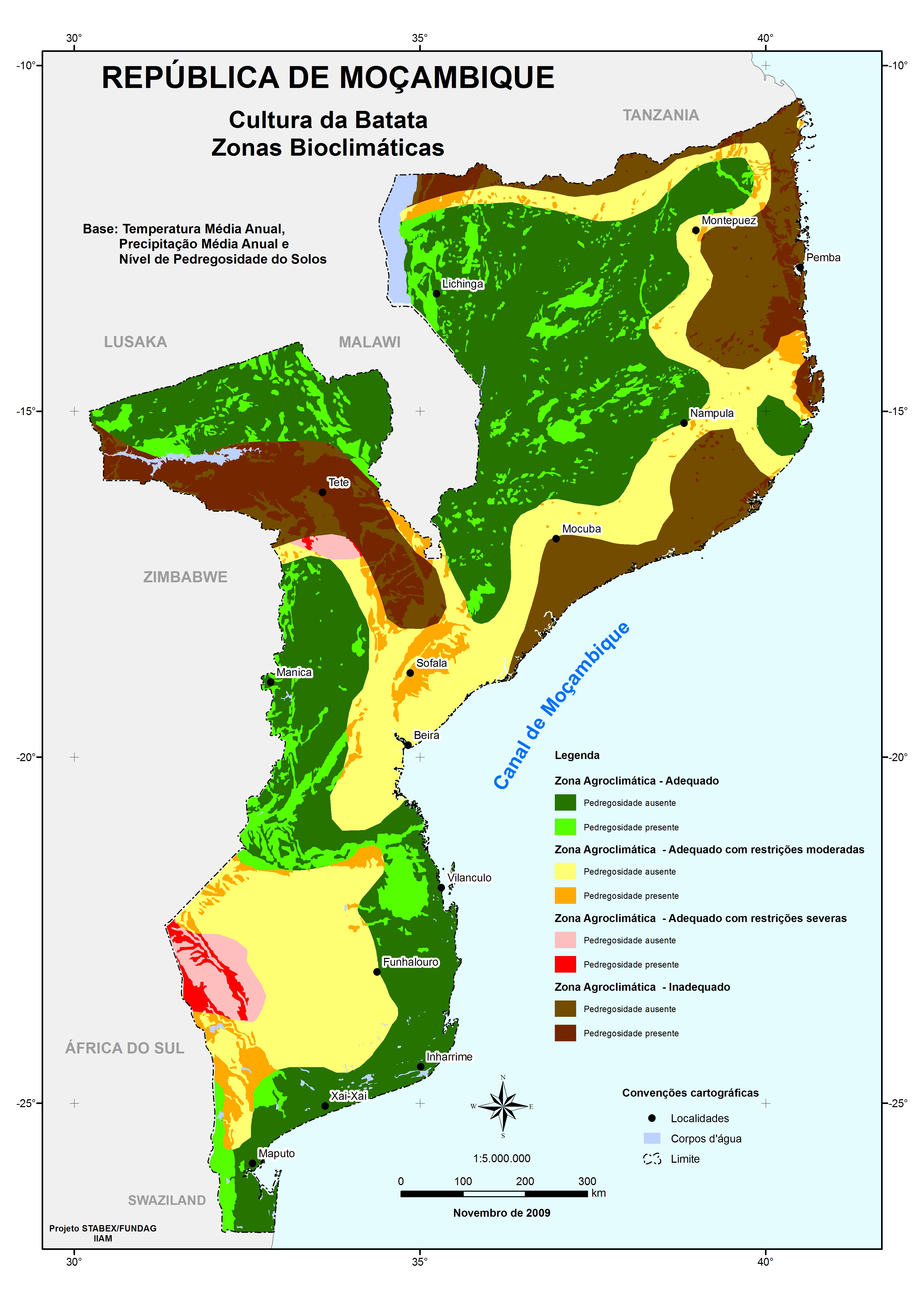 Além disto, o zoneamento agro-ecológico pode fornecer informações complementares sobre o risco climático em determinadas fases da cultura como: altas ou baixas temperaturas, seca ou chuva em excesso, indicando assim o risco climático e a viabilidade de sucesso e produção. No contexto geral do presente trabalho pretende-se melhorar a qualidade da informação agronômica, e meteorológica, além de caracterizar as micro-regiões aptas à exploração agrícola das culturas do algodoeiro, batata reno, caju e mandioca promovendo emprego e renda, favorecendo a melhoria social e cultural da sociedade e do povo Moçambicano. Além disto, acoplar ao trabalho já realizado sobre as Zonas Agroecológicas, informações fitotécnicas e de sustentabilidade agrícola, divulgando à população, agricultores e sistema produtivo em geral informações agrometeorológicas e climatológicas sistematizadas importantes no planejamento e uso racional da terra e da água, assim como preservação dos recursos hídricos e sustentabilidade ambiental.